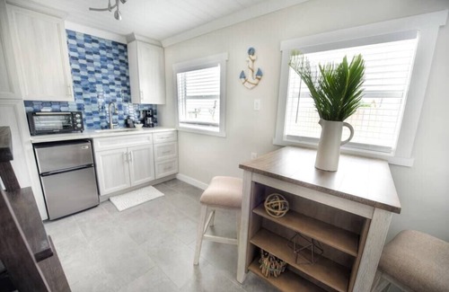 **Boathouse** is a studio villa located within a private gated waterfront retreat consisting of (10) one and two-bedroom villas right on the Banana River with beach access across Hwy A1A. Villa includes a queen-size bed open to a full-size sofa bed, 50" smart TV, walk-in shower, kitchenette room equipped selective appliances, dishes, silverware and a table and chairs. Complimentary access to stand-up paddleboards (SUP), kayaks, and surfboards.