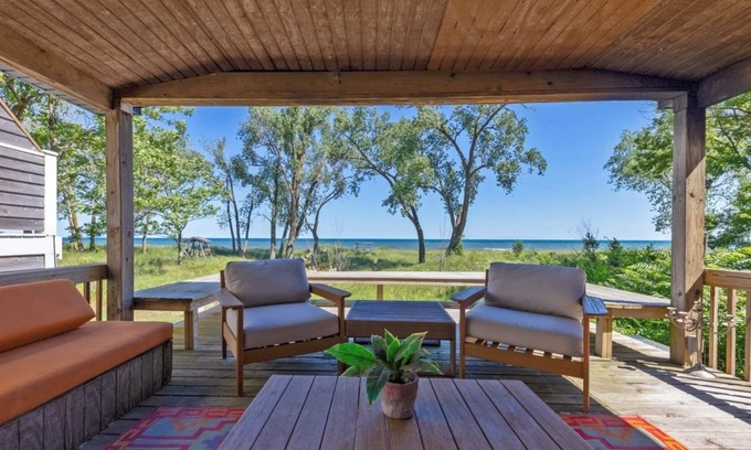 In the National Park! This eclectic Bohemian waterfront- direct beachfront property with over 5000 sqft of living space features 6 patios, 4 stories, 3 laundry rooms, 2 kitchens,(2 king beds, 13 queen beds, 5 queen sleeper sofas)7 beautiful bedrooms and 5 bathrooms designed for comfort and maximum fun. Jacuzzi hot tub, Firepit, outdoor shower, grill and a private all sand path to the huge beach. 6 patios including rooftop decks and patios add to the charm of this home. This property is perfect with breathtaking water views and 45 minutes to Chicago!