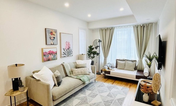 Discover our charming boho-chic retreat near downtown Markham, the Pan Am Center, and York University. Perfect for events and graduations, it accommodates up to 7 guests. Enjoy the convenience of a nearby high-quality local grocery store and a delightful array of shops within walking distance, including bubble tea cafés and beauty and wellness centers. Direct bus stops to Unionville Go Station and Finch Go Bus Terminal are also nearby. Your perfect stay awaits!