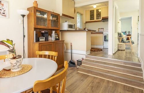 There is off-street parking on the front nature strip. As there are a small number of steps at the entrance to the front garden and in the cottage, a slightly sloping 25-metre garden path to walk down before you reach the cottage itself, and the floor levels are also slightly uneven in places, this cottage is probably not suitable for guests with reduced mobility or with young children.