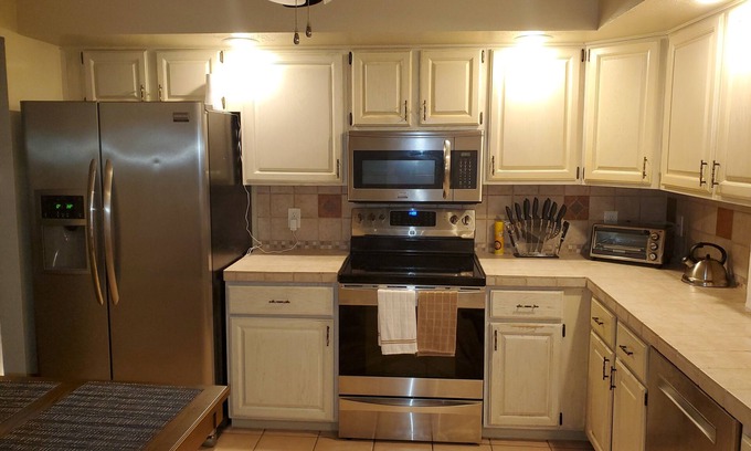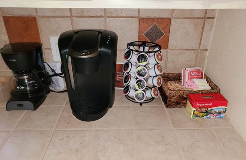 There is a fully equipped kitchen with an electric stove, microwave, dishwasher, toaster oven, coffee maker and a Keurig machine. In addition, there are also pots, pans, plates, tea cups, glasses and silverware for your convenience. We provide complimentary K-cups and bottled water.