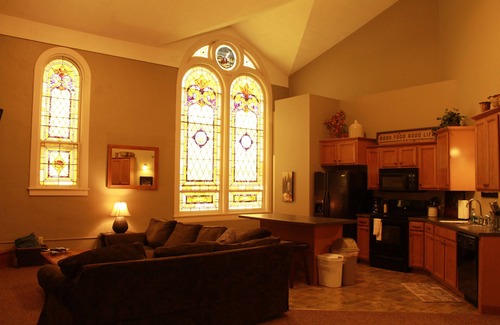 Beautifully remodeled former church & theatre with Grand 24 ft ceilings and original stained glass windows.