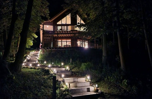 Amenities: Fully equipped kitchen, laundry room, complimentary Wi-Fi, smart TVs, and a wraparound 2-tier deck offering stunning lake views through floor-to-ceiling windows.