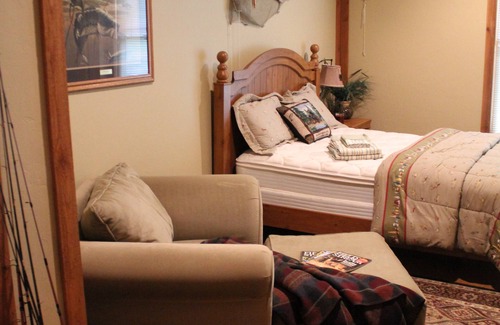 • 'Fishing Room' downstairs = 1 queen bed & full private bath with quaint electric fireplace (sleeps 2)