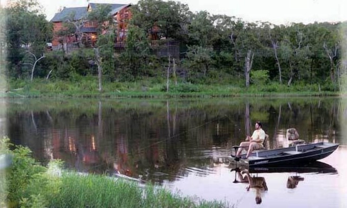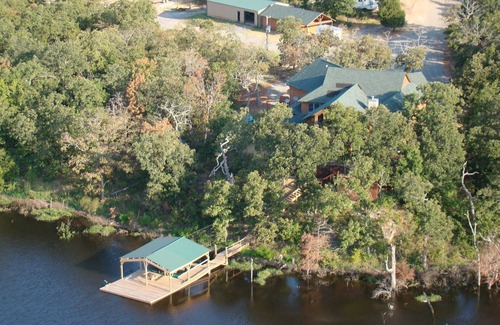 A Private, Peaceful, Spacious Hideaway! This Secluded Luxury Retreat is on our Private Lake with >5,000 sf deck and Sleeps 32 guests. Located 4 miles E of Vamoosa, OK.