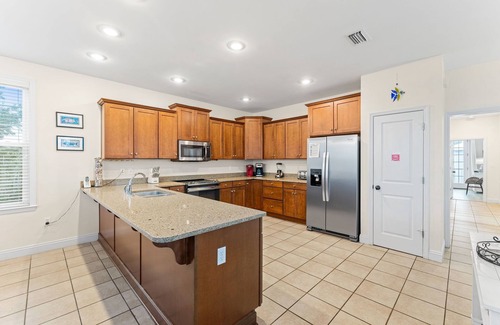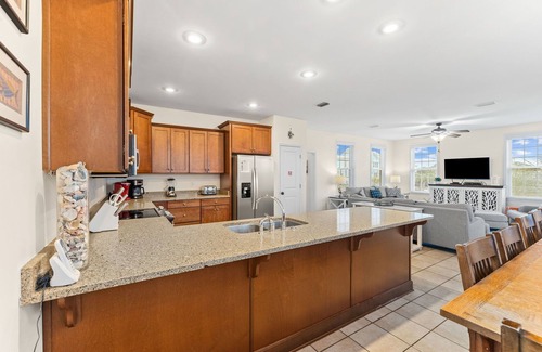 With simple southern elegance, this cozy home offers a respite from the hustle and bustle of everyday life. Use the outside stairs to reach the second floor, where the kitchen, living, and dining areas reside. Multiple plush couches and a 65" Roku Smart TV in the living space provide the perfect setting for a family movie night. Thanks to the open floor plan, the chef of the group won't miss a moment of fun while whipping up a delectable meal in the fully equipped kitchen, featuring high-end appliances and spacious counters. When it's time to eat, pile in at the 12-person pub-height dining table! Through the French doors, enjoy the coastal sunsets from the privacy of a small balcony overlooking the pool. Enjoy easy access to the guest bedroom on this floor, which has a fluffy king bed and wraparound balcony with gorgeous vistas.