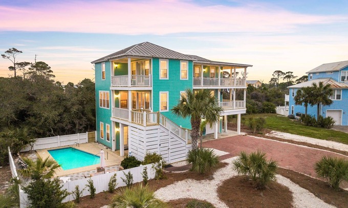 DETAILS: Experience an unforgettable escape at Sunsational in North Cape San Blas, a stunning 4-bedroom, 4-bathroom haven designed to accommodate up to 12 guests in total comfort. Part of Florida's Forgotten Coast, this laid-back stretch of the St. Joseph Panhandle has a classic beach town vibe, sparkling turquoise water, and sugar-soft sand beaches. Guests will love this pet-friendly abode's private pool and spacious balconies—only a short 0.3-mile stroll or bike ride from the dog-friendly beach!