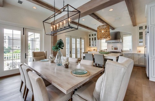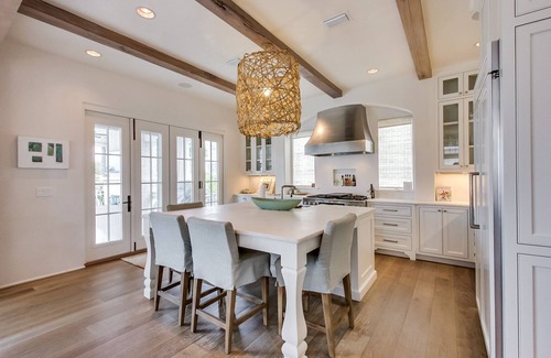 The chef's kitchen features designer cabinets, marble countertops and select stainless appliances, including a gas range. The dining area offers seating for 8 under a beautiful candelabra-style fixture, while the kitchen island has seating for an additional 4 guests. Table seating out on the deck can accommodate another 4. The living room has a flat-screen television, a timber beam ceiling, window transoms and access to the balcony. Open the doors and the living room becomes an extraordinary outdoor room. The private pool offers a partially covered patio area, creating a wonderfully intimate setting. *Please note: Fully opening the doors is not available during summer months due to humidity/swelling*