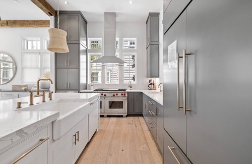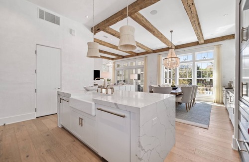 Upon arrival at this sunny 3,902 square-foot escape, a classic coastal exterior charms guests. In the combined living and dining area, hand-scraped hardwood floors span beneath 12-foot ceilings, accented with reclaimed beams. Gather the group on the plush sectional and armchairs for a movie night on the 75” Smart TV and Sonos soundbar. The gleaming kitchen’s Wolf and Sub-Zero appliances and spacious central island provide a pristine playground for culinary enthusiasts. Dine at the table for 8, with 4 more seats at the island. Fold back the NanaWall to merge the living room with the screened porch, where guests can grill, recline, and dine while enjoying the view of the nearby tidal pond. Cushioned loungers surround the private pool in the courtyard. As the day winds down, the primary bedroom with a king bed, private bathroom, and soaring cathedral ceiling offers a lavish spot to rest.