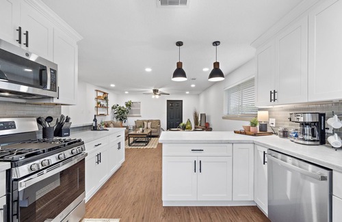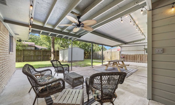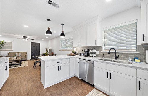 Relax and recharge at this remodeled 3-bedroom, 2-bath retreat just steps from the beach! Perfect for beach escapes or business trips. Enjoy plenty of space, an arcade game, a fully equipped kitchen, and a relaxing outdoor area. Walk to El Jardin Beach or drive to Kemah Boardwalk. Book your stay today and soak up the coastal charm!
