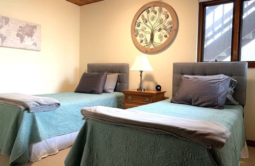Moving to the lower level, you'll find the sleeping quarters. Two bedrooms are furnished with queen beds, while two additional bedrooms offer twin beds, making it convenient for accommodating different sleeping preferences. There's also a king bedroom with an ensuite bathroom for added comfort and privacy. Plus, an extra office space is available for your convenience.