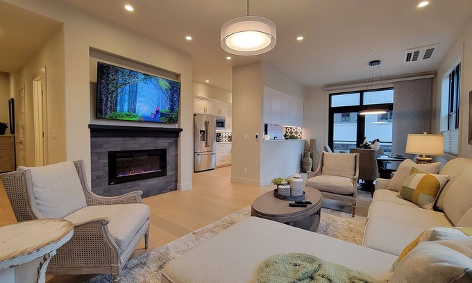 heated floors, a fully appointed modern kitchen, and great room with state-of-the-art fireplace. Covered parking just steps from the secured foyer with elevator to 2 nd floor with adjacent fast charging stations.