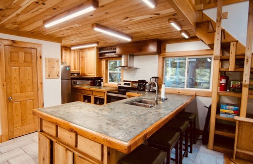 To access the cabin from the parking area, there is an uphill walk of 150' and then two flights of stairs, which lead to the first main porch and hot tub. Just inside the front door, you'll be in an entryway with custom built shelves, hooks and benches for storage and gear. There are two bedrooms on this first level, one with a queen sized bed, the second with two sets of bunkbeds. The main bathroom is also located on this level with a custom concrete countertop inlaid with quartzite our kids harvested from the creekbed below, a large shower with a glass door, toilet and a new washer and dryer set for your use. A second full bathroom is located in the basement of the cabin - there are photos of our family building it together along the hallway down there! :)