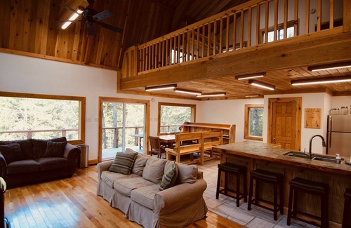 From here, for the ulimate sleeping spot, there is one more set of stairs leading to the large loft. Taking advantage of the specially designed arched trusses, we've created a space for reading bedtime books, relaxing, checking on the view outside or sneaking in a nap while others cook or enojy the sofas! There are two sets of bunk beds in the loft. The first has two twin mattresses and a trendle bed that can be pulled out, for an extra sleeping spot. The second has a queen below and a twin mattress above. Lastly, there is a queen sized bed located between the two bunk beds....all these sleeping spots have fantastic views and are great spots for hearing the gorge nightlife sing!