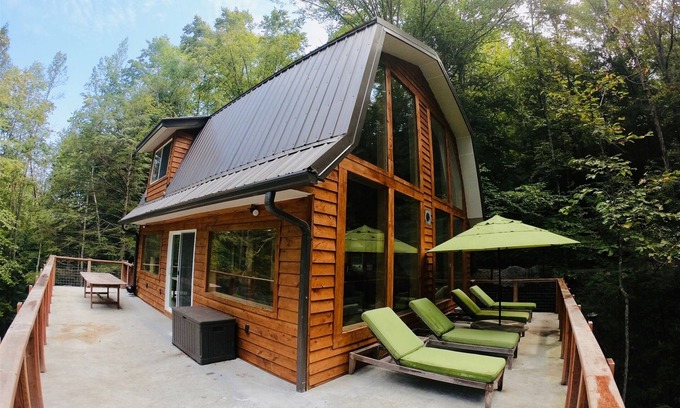 The large kitchen, valted ceiling with floor to sky windows, custom conrete countertops and woodworking all pale in comparison to the beauty of the forest just outside, although they are all also wonderful in their own right! Our favorite feature of this cabin are the double wrap around concrete porches, exterior firepit and hot tub...all beckoning everyone to turn off the screens and turn oneself outside to the leaves, rocks, critters and beautiful sky of the Red River Gorge.