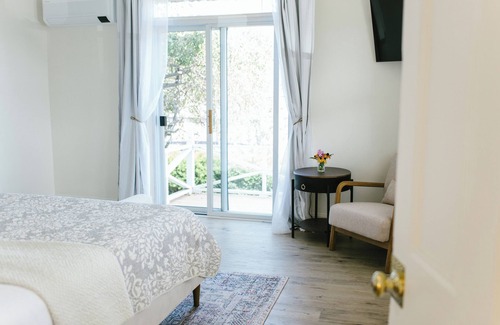 This bright and spacious studio apartment is located on the first floor of the main house, ensuring easy access. The room is thoughtfully designed for your comfort and convenience, featuring a plush king-sized bed adorned with cozy linens. Enjoy the coastal breeze or adjust the temperature with the AC and heating system to your liking.