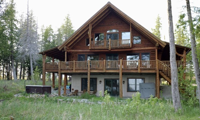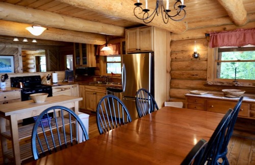 This stunning log home is custom-built with three levels of living space that include a walk-out basement with a stone patio and hot tub. There are 5 bedrooms and 3 bathrooms, with sleeping for up to 13 people, all nestled on a private 1.2-acre wooded lot. There are beautiful hardwood floors and a two-sided wood fireplace between the great room and kitchen.
