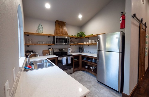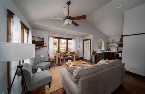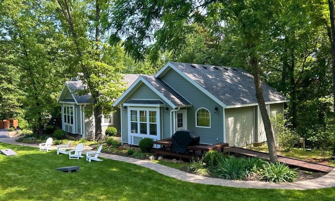 Welcome to our beautiful cottages completed on 09/2018. At the end of a newly paved driveway and located on 3 acres of secluded woods with additional grassy playing fields. These two Craftsman-style cottages are rented as one combined unit, connected by a covered breezeway with convenient keypad locks. Both cottages offer hardwood floors, vaulted ceilings, custom cabinets, and quartz countertops. They also feature ceiling fans, tiled bathrooms, outdoor decks with built-in benches and propane bbq grills. The cottages are surrounded with winding walking trails in the woods for your outdoor enjoyment. Master bedrooms have king beds and a private bathroom with a walk-in shower. 2nd bedroom features two extra long twin beds. 2nd bathroom features a tub/shower combo. Couch makes into a queen size bed so each cottage can sleep up to 6 people! The cottages have a smart TV and free wifi. Appliances include a washer/dryer, refrigerator, microwave, oven/range, dishwasher, garbage disposal, as well as a coffeemaker, toaster, blender, hand mixer, crock pot, ice cream maker, pots and pans, dishes, glassware, and all utensils. Outdoor features include volleyball, pingpong table, whiffle ball, horseshoes, cornhole toss a firepit with outdoor lights and a hammock. Less than 2 miles away is a shopping center that has Sunfest grocery store, Pizza World restaurant, Dollar General, Ace Hardware and Family Pharmacy. The Branson Landing is 5 minutes away with lots of shopping and restaurant options.