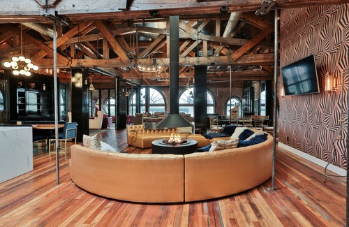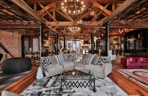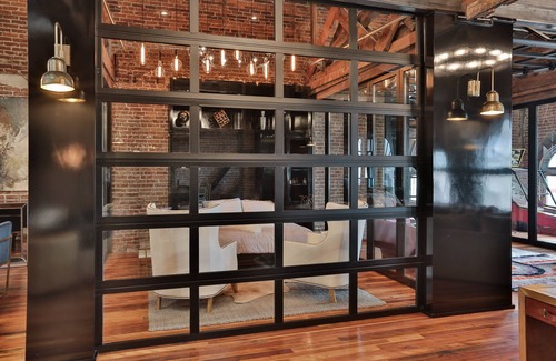 This swanky loft has so many WOW factors your eyes will be dancing! Enter the setting through the vintage revolving door or conveniently on the elevator and arrive on the scene of this character-packed accommodation. The owners have transformed this late 1800s space from what was once a clothing factory into what looks like a scene from a James Bond movie. You’ll enjoy features from its former glory such as original trusses, exposed brick and hardwood floors. And the updated details will blow your mind.