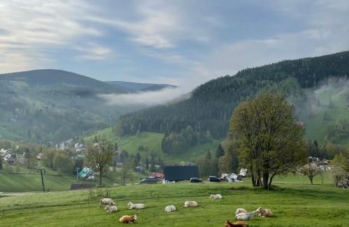 Featuring garden views, Bouda u vleku in Pec pod Sněžkou offers accommodations, a garden, barbecue facilities, and a shared lounge. Private parking is available on site. The chalet features mountain views, a sun terrace, and free Wifi is available throughout the property. All units comprise a seating area with a sofa, a dining area, and a fully equipped kitchen with various cooking facilities, including a dishwasher, an oven, a microwave, and a toaster. A fridge, a stovetop, and kitchenware are also available, as well as a coffee machine and a kettle. At the chalet complex, each unit includes bed linen and towels. Guests at the chalet will be able to enjoy activities in and around Pec pod Sněžkou, like hiking. Skiing and cycling can be enjoyed nearby, while ski-to-door access and ski storage space are also available on-site. Bus Stop Strážné is 13 miles from Bouda u vleku, while Western City is 21 miles from the property. Pardubice Airport is 60 miles away.