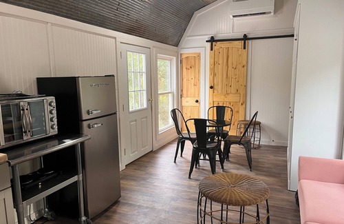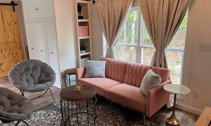 Please note: there is NOT A POOL OR HOT TUB included in your stay. You must rent the event center for access to this area. Your Eureka Springs adventure begins at this quaint yet bougie tiny home! Its lovely gold chandeliers and pink sofa make it bougie, yet nestled in the boondocks surrounded by 143 acres of nature on the property! This 1-bedroom-studio retreat features a cozy living room with a queen Murphy bed. There is also a loft with floor mattresses (aka, The Fort) perfect for no more than 2 kiddos… just bring sleeping bag & pillow!