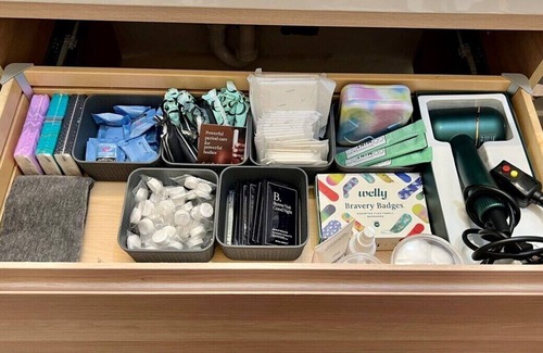 Thinking of a perfect way to end your day or start anew after a great night's rest? Both colorful bathrooms will inspire you to be your best you, complete with soft & fluffy towels, full selection of toiletries (cotton balls, q-tips, feminine products, make-up removal wipes, and more), as well as Public Goods all-natural personal products just for you.