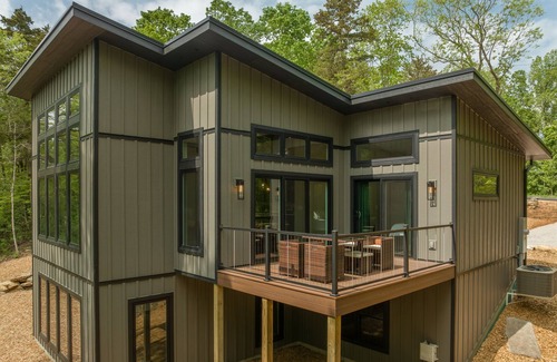 Designed with relaxation and entertainment in mind, this NEWLY CONSTRUCTED treehouse is able to accommodate 8 guests comfortably in 3 bedrooms and 2 full bathrooms. The modern, high-end property features an open floorplan with a fully equipped kitchen and oversized island, quartz countertops in the kitchen and bathrooms, stainless steel appliances, dining area, custom soft-close cabinetry, and tall windows lining each elevation with stunning birds-eye views.