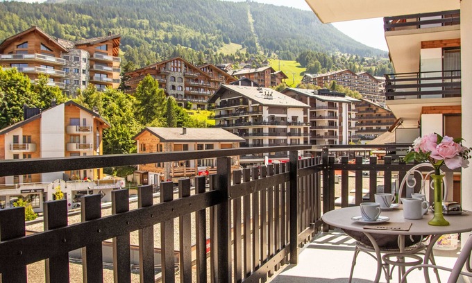 "Bouleaux A1", 3-room apartment 73 m2 on 1st floor. Beautiful and modern furnishings: living/dining room with open-hearth fireplace, cable TV and hi-fi system. Exit to the balcony, south facing position and west facing position. 1 room with 2 beds (90 cm, length 200 cm). Exit to the balcony, north facing position. 1 room with 2 x 2 bunk beds (90 cm, length 190 cm). Exit to the balcony, north facing position. Kitchen (3 hot plates, oven, dishwasher, toaster, kettle, electric coffee machine, Capsules for coffee machine (nespresso) extra, raclette grill, fondue Set (chinoise, cheese)). Bathroom, sep. WC. Balcony, south facing position and west facing position balcony, north facing position. Balcony furniture. View of the mountains and the resort. Facilities: washing machine, children's high chair, baby cot, hair dryer. Internet (WiFi, free). Parking space n 12. Please note: non-smokers only. Maximum 1 pet/ dog allowed.