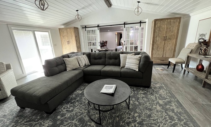 This one of a kind, stylish place to stay is perfect for group trips and families. Plenty of parking for boats for side x sides. This house sleeps up to 11 people with double bunk beds in the 2nd bedroom and a sofa that folds out to make a double bed. There are 2 patios, one that offers an outdoor sofa, gas firepit, covered hot tub, and gas grill. The side patio has a wood burning firepit and opens up to the bar/ entertainment area. The huge table seats 10 people comfortably with extra seating at the kitchen bar and patio bar. The house is great for entertaining large families or a comfortable a refuge after a day at the lake! The kitchen comes fully stocked with all of the cooking necessities, just bring your own food! Crockpot, Keurig, drip coffee, baking pans, and all of the kitchen utensils are provided.