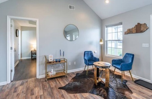 The Rickhouse is a 3 bedroom 2 bathroom bourbon themed home that features an open floorplan with a connected kitchen, dining, and living area. The primary bedroom and en-suite bath are accessed from the living room while the additional two bedrooms and bathroom are accessed from the living area and on the opposite side of the house. Off of the kitchen you will find the wooden deck and grilling area. Below the deck is a brand new hot tub that accommodates six people and is surrounded by string lights for those relaxing evenings. The backyard is fully fenced and perfect for your four-legged friends to enjoy. During your stay you will have a private drive way (large enough for three sedan/SUV sized vehicles) for parking. The Rickhouse offers a full family experience, but keep in mind that if you have babies/infants the home is not baby proofed. A pack and play and booster seat are provided for your use.