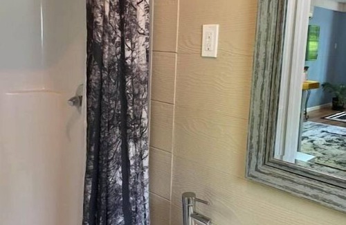 -Kitchen has a small fridge with freezer, a stove and is fully equipped with everything you need for cooking meals, microwave, air fryer, keurig coffee maker stocked with coffee pods