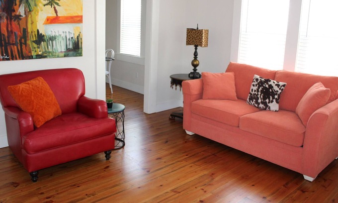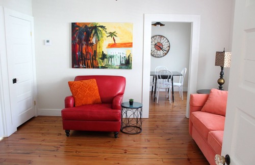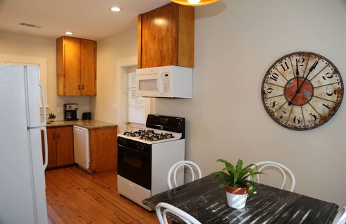 The beautifully decorated space offers all the conveniences of home and the delightful elegance of an exquisite vacation rental. Hardwood pine floors span the one bedroom, living room, and kitchen. A gas stove, granite countertops, microwave, dishwasher, and full-size refrigerator make up the complete kitchen. Soak in the luxurious clawfoot tub or shower featuring chrome fixtures. After all the sightseeing, dining, and nightlife you’ll find nearby, you’ll sleep like a baby on a gorgeous, brass, West Elm full-size bed with a comfy quilt and Brentwood Gel Memory Foam Mattress. Relax and unwind in the living room complete with a 40-inch flat-screen, cable TV, and foldout couch. In addition, enjoy the convenience of a washer and dryer on the back porch. In addition, you’ll be able to post all your vacation photos via high-speed WiFi.