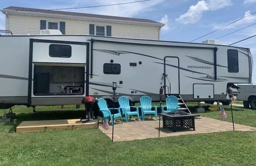 Beautiful 2021 Forrest River Salem Hemisphere RV featuring an impressive floor plan with main bedroom and bathroom at one end, a beautiful living/dining area, and an oversized bunk room with its own bathroom at the other end. Comfortably sleeps 10 people, fully stocked with dishes, cookware, Keurig, patio, outdoor kitchen, grill, fire pit, and more. This RV is situated in close proximity to a public boat slip and a short walk to the very private beach of Bowers Beach. Bring your boat or water craft to enjoy this fisherman/boater’s paradise on the Murderkill River at the mouth to the Delaware Bay. This permanent site is close enough to enjoy Lewes, Rehoboth Beach, and the tax free shopping of the Rehoboth Outlets. It is also just a few minutes away from DE Turf.