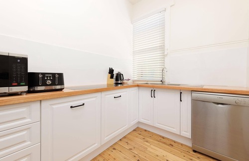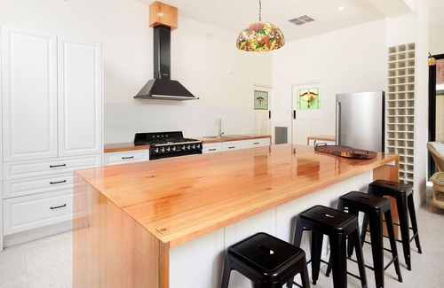 Boasting four large queen bedrooms with lux mattresses and linen, this Federation style home has been tastefully modernised in every way whilst retaining the best of the original decorative features such as stain glass windows and ornamental fireplaces. There is an ensuite to main bedroom, and large sleek bathroom servicing the other three bedrooms. There is a single bed in one of the bedrooms as well as the queens, so house comfortably sleeps 9 in four bedrooms.