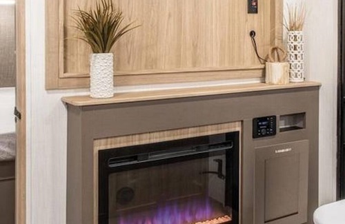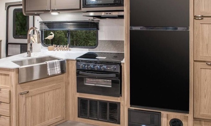 This model offers two entry doors so that you can easily slip out in the early morning and head out on a fishing trip, or you can use the rear entrance door to directly enter the bathroom from outside instead of walking through the entire trailer. There is also a mini-fridge outside for added convenience.