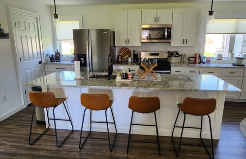 This spacious, modern home offers 3 bedrooms, 2 full bathrooms, and a bright, open-concept layout perfect for relaxing or gathering as a group. The main bedroom features a king bed, room-darkening shades, and an ensuite bathroom with a shower and bidet—plus space to set up a crib if needed.