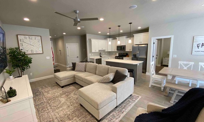 Brand new build, beautifully decorated farmhouse style townhome in the wonderful red-rock landscape of Hurricane, Utah. This is part of the Luxurious Zions Village Resort that includes many amenities like a large pool, lazy river, hot tub, firepits and outdoor grills. This is a 4 bedroom, 3.5 bath, townhome with a two car garage. Zions Village is located in a fantastic location. It can sleep up to 14 people. There are two lakes near by, for boating, swimming and kayaking. Zions National Park is less than 20 minutes away. Sand Hollow is a 10 minute drive, known for boating, fabulous rock crawling and OHV riding. This location is also very close to world class mountain biking trails like Gooseberry Mesa, Jem, and Holy Guacamole.