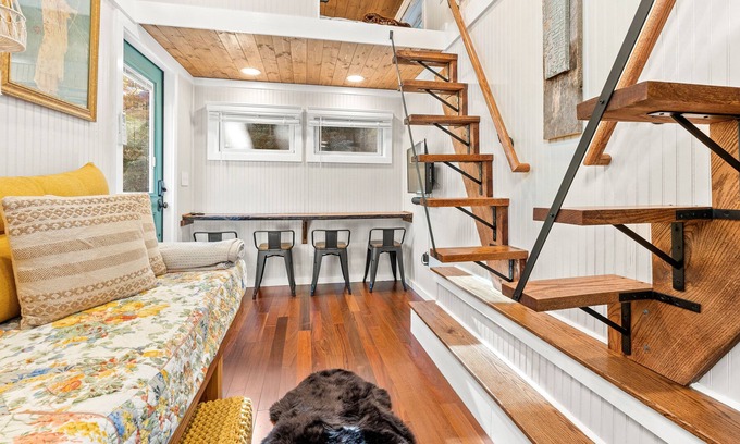 Brand new custom Tiny House on wheels. At the back of a large property with a park-like setting. Amenities include Outdoor tub, High Speed Starlink internet, Smart TVs, Full kitchen, Full bath, 2 lofts (queen and full bed) plus a day bed in the living. Located off of scenic Wayah road, Only 10 minutes to Downtown Franklin Main Street with shopping, brewery’s, and Dining. Property is across the street from national forest with USFS access adjacent. A short drive to the fire tower, Appalachian trail or Bartram trail access. Tons of hiking and waterfalls very close and the NOC and Lake Nantahala is over the mountain. When you’re done exploring, come relax in the outdoor tub. veg out on the couch, sit by the fire pit or relax on the deck and listen to the birds and the flowing creek.