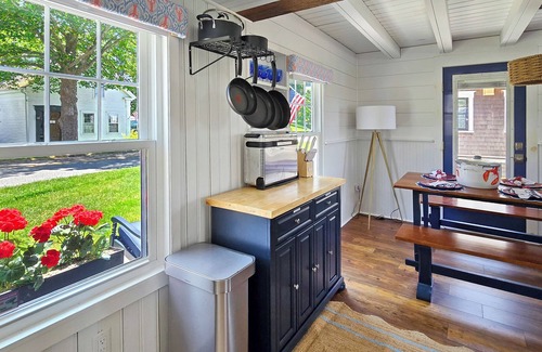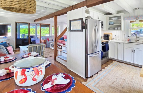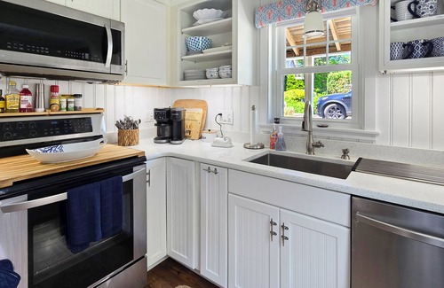At the front of the cottage beyond the living room is a dining area with large table and bench seating. Around the corner is the nicely equipped kitchen with stainless appliances including a stove, refrigerator, dishwasher, microwave, drip and Keurig coffeemakers and air fryer.