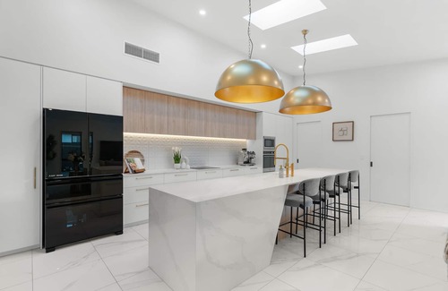 Each of the lavishly well-appointed bedrooms is furnished with a plush queen bed, aside from the master bedroom which boasts a king bed of the highest quality, ensuring a restful night’s sleep for all guests. The living areas are exquisite, with flowing spaces bathed in light and sun, and the kitchen will satisfy the most discerning cook, baker or entertainer. Sleek and refined, with stone counters and the highest-spec'd appliances, the main kitchen with its induction cooktop is complemented by an adjoining scullery with its own gas cooktop, and second fridge and dishwasher. A separate walk-in pantry makes for the ultimate workspace and under-tile heating flows from the kitchen to open-plan dining, which nestles alongside a sitting area. Both spaces open to outdoor living, perfect for unwinding and relaxing amongst all the beautiful plantings and flowers on a generously oversized Kwila Deck.