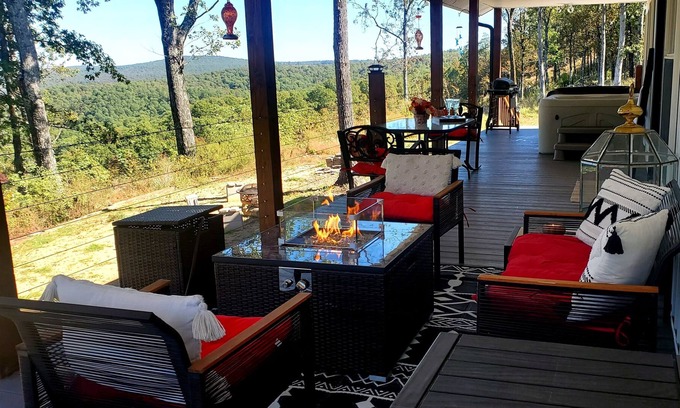 ENJOY our New cabin completed in November 2022. Our10x49 foot back porch with views of the Ozark National forest (our back yard) has relaxing seating and extra dining space for you to have an unobstructed view while you enjoy your meal. Steps off the back porch is a firepit area for those memory making moments with the family under the stars. If it's too cold outside have a movie night and enjoy the 75-inch TV in the living room and turn on the fireplace to get cozy. Enjoy the kitchen and everything you need to make your favorite meals. Luxury and nature go hand in hand in our cabin with large walk-in showers and double vanities and plush king size beds. We aim to make your stay one you enjoy and book with us again and again. We have added a hot tub on the back porch for total relaxation while enjoying the mountain views and nature. We have hiking guidebooks for you to explore the area and many of them are pretty close to our cabin! The Ozarks are beautiful any time of year and if you love the outdoors or want to kayak the buffalo we have an outfitter in Jasper who can get you taken care of. Hope to see you soon!