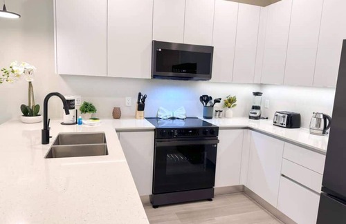 • Bedroom 2 (upstairs): King bed + ensuite bathroom with double vanities and walk-in shower