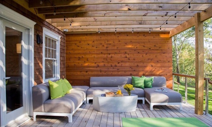 Private outdoor deck with intimate lighting for outdoor dining and lounging with harbor views.