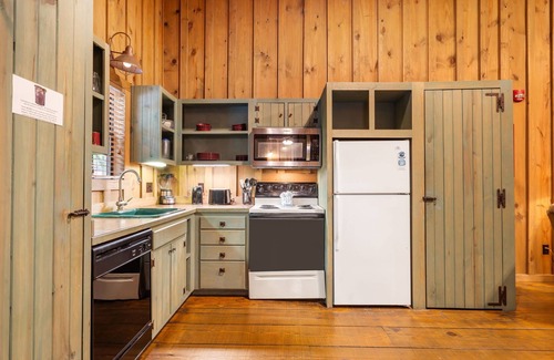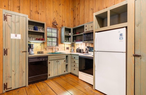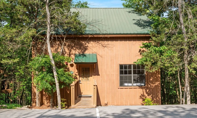 Tucked into the peaceful and wooded Cabins at Green Mountain resort, The Hideaway is a cozy, pet-friendly 2-bedroom cabin just minutes from Branson's best-loved shows, shops, and restaurants. 🛶 This multi-level retreat blends rustic charm with modern comfort and includes access to two seasonal pools, a bubbling hot tub, outdoor grills, and scenic walking trails along the creek. 🌿