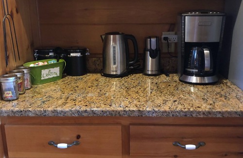 Soak your stress away in the hot tub overlooking the mountains or "rock" it out in one of the rocking chairs that line the deck. The hot tub is drained, cleaned, and refilled before each guest. The unique outdoor tree-stump gas fireplace is operational year-round, making it a great gathering spot.