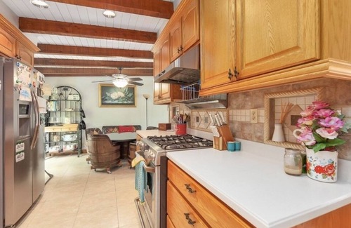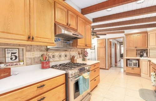 The large open living and dining area is set up in a way to make large groups comfortable. There’s nothing missing in the kitchen either. Everything you need to feed a large group can be easily found.