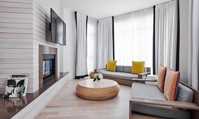 Welcome to your beachside escape! Your spacious room boasts a unique design, featuring a cozy fireplace and a kitchenette outfitted for convenience, making it an ideal choice for families or couples seeking a relaxing and well-appointed stay in a prime location. Our boutique hotel stands out with its vibrant creativity and bold approach to design. Step into our lively lobby, where foosball and pool tables await. Plus, take advantage of the exclusive amenities at our sister property, Wave Resort - from the modern gym and stunning private beach views to the welcoming seasonal heated pool.