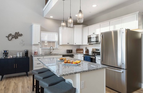 Downstairs is where the fun begins! Enjoy a multi-cade featuring 80's and 90's arcade games, a PS5 gaming system, a Nintendo Switch cradle, a giant light bright, and a sunset-themed living area with fun chairs, bean bags, and a couch. There is also a covered patio that houses a 7-person hot tub with easy lift top removal and handrail, a gas fire pit, two hanging egg chairs, and outdoor games like Jenga and Giant Connect 4. The lower level also features oscillating fans and electric heaters, for your comfort.