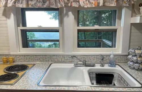 One bedroom with one King Size bed. Cozy living room with electric fireplace, console stereo and smart tv. Fully equipped kitchen with cooking basics. Dining area. Bar cart to mix up some classic cocktails. Full bath. Spacious, pet safe deck with a breathtaking view! Fenced in front yard with covered porch with swings.