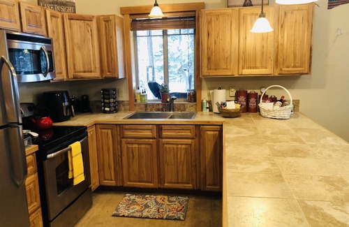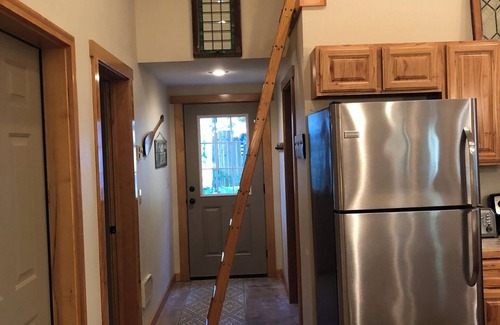 The space is functional and inviting with seating for 4 at the peninsula and a card table with 4 chairs for additional seating. The bedrooms are equip with phone charging cables and wall mounted TV's. All TV's have a DVD player and an extensive movie collection to choose from. Bedroom #1 has a King sized bed. There are 9 stairs required to access bedroom #2 which has a queen sized bed. Large loft space for children 6 and older and adults can use this space as well but requires climbing an 8 foot ladder to Access area. The loft has a queen bed, TV with Roku and DVD player.